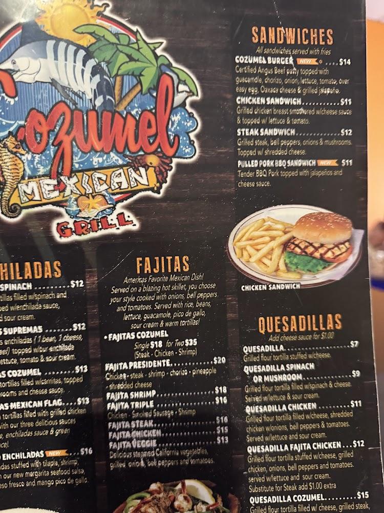 The menu at Cozumel Mexican Grill is extensive and thoughtfully crafted. From appetizers like 'Lupita Buffalo Fries' to generous entrees such as 'fajitas,' there is something for everyone. Vegetarian and kids' selections also ensure all dietary needs are met, creating an inclusive dining experience.